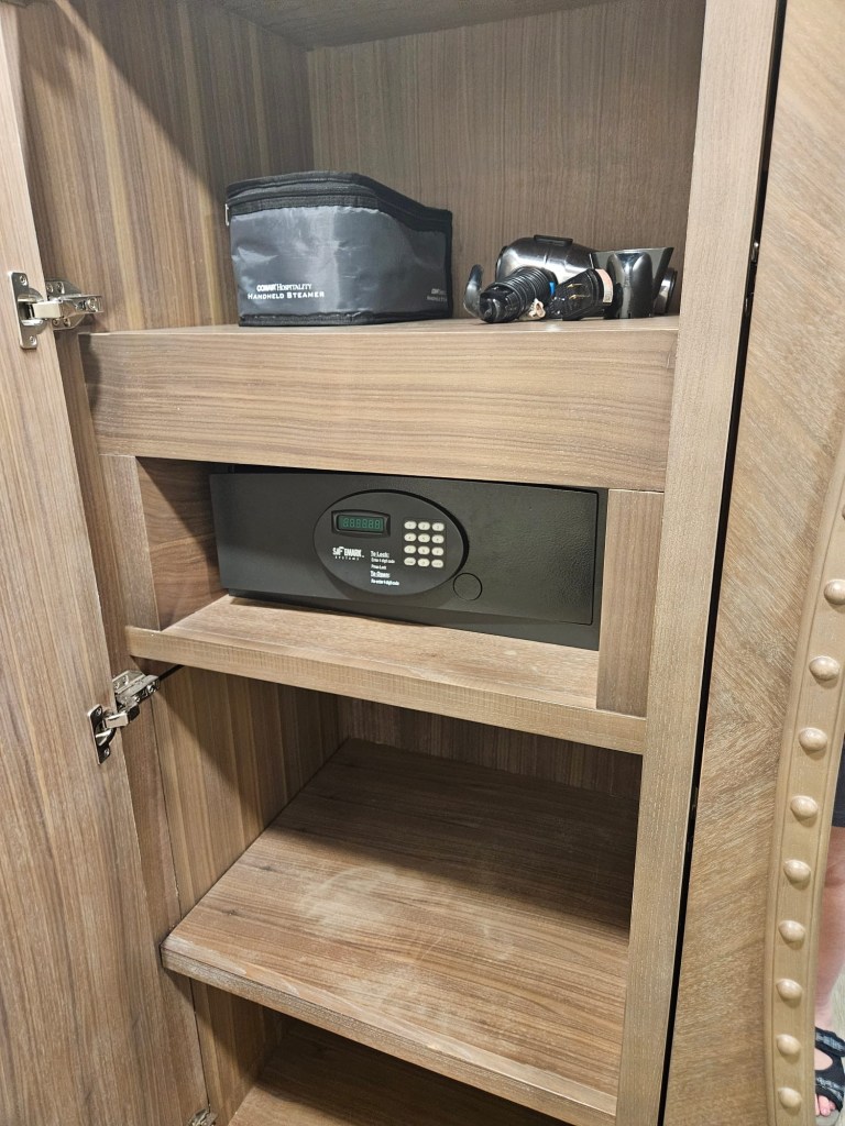 The room is a standard Disney Deluxe room, with 2 queen beds and subtle, not over-the-top, theming. The bathroom is also standard with 2 sinks in the hallway alcove, and the toilet and shower in the bathroom. There are plenty of outlets and lighting. A coffee maker with supplies, good sized closet, wall mounted tv, and a balcony.