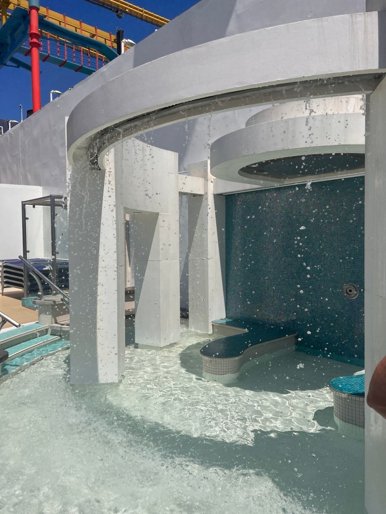 Spice H2O is the adult deck with a waterfall pool feature, bar and hot tubs.