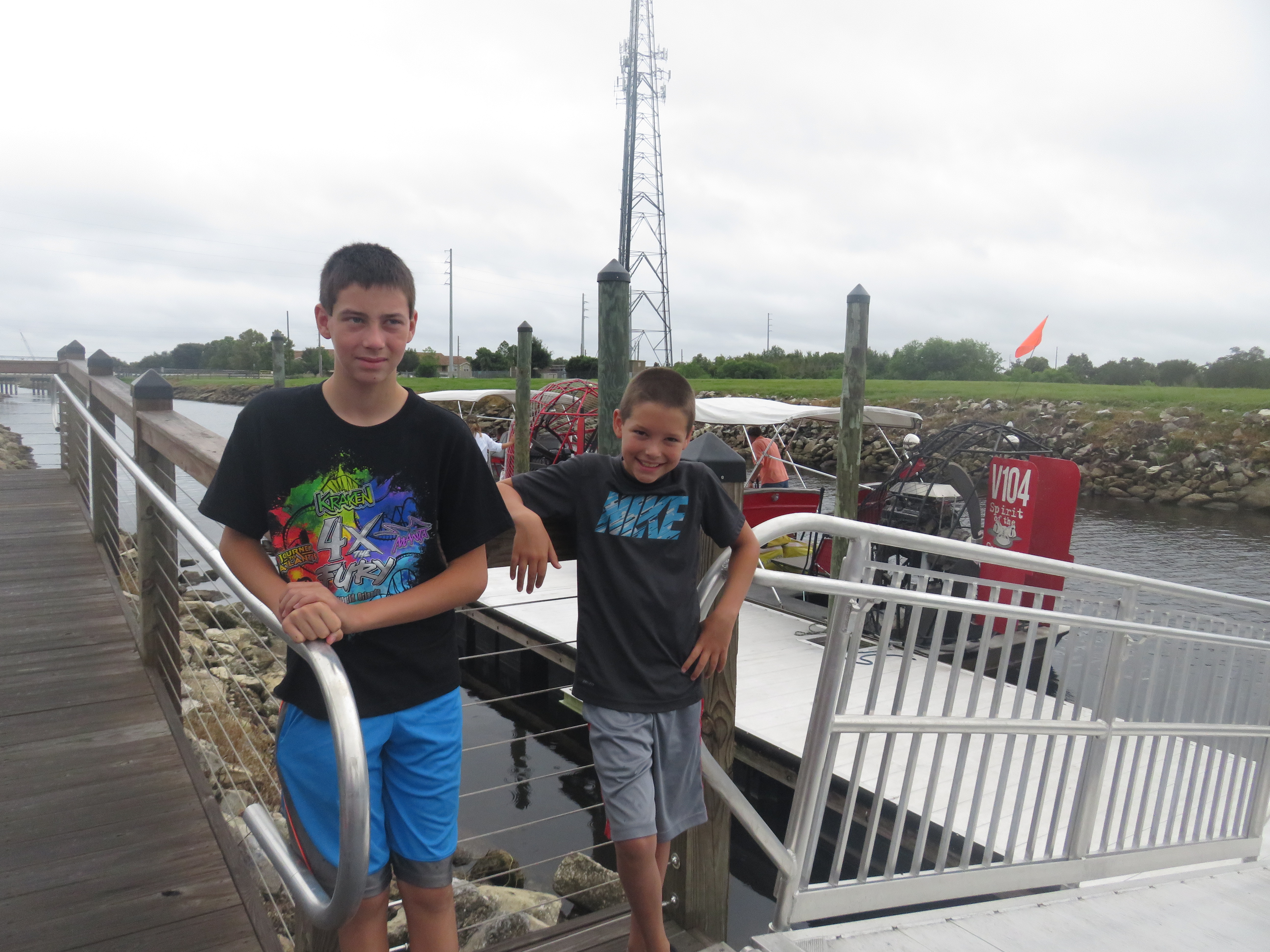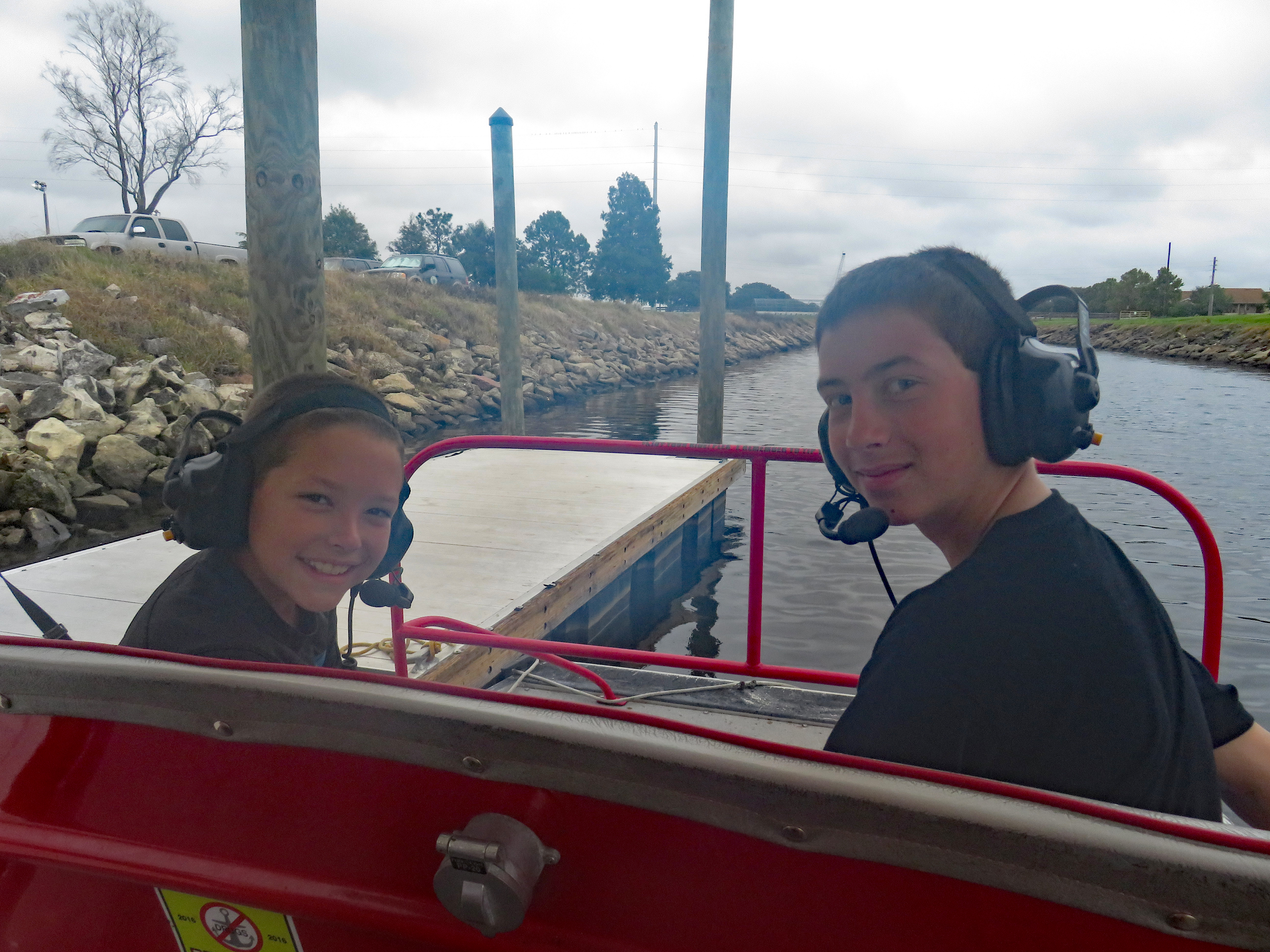 We drove out to Kissimmee and Lake Tohopekaliga to the address from the website. We were a little worried as it was raining most of the way and a hurricane was bearing down on Florida. We didn’t know what to expect and we arrived to a park with a playground, a restroom, a dock area with the air boats and the address was a private residence. You check in right at the dock and they use the private house address so your GPS will get you there, it was a tad confusing when we first drove in, but it worked. There appeared to be another air boat company there as well.
