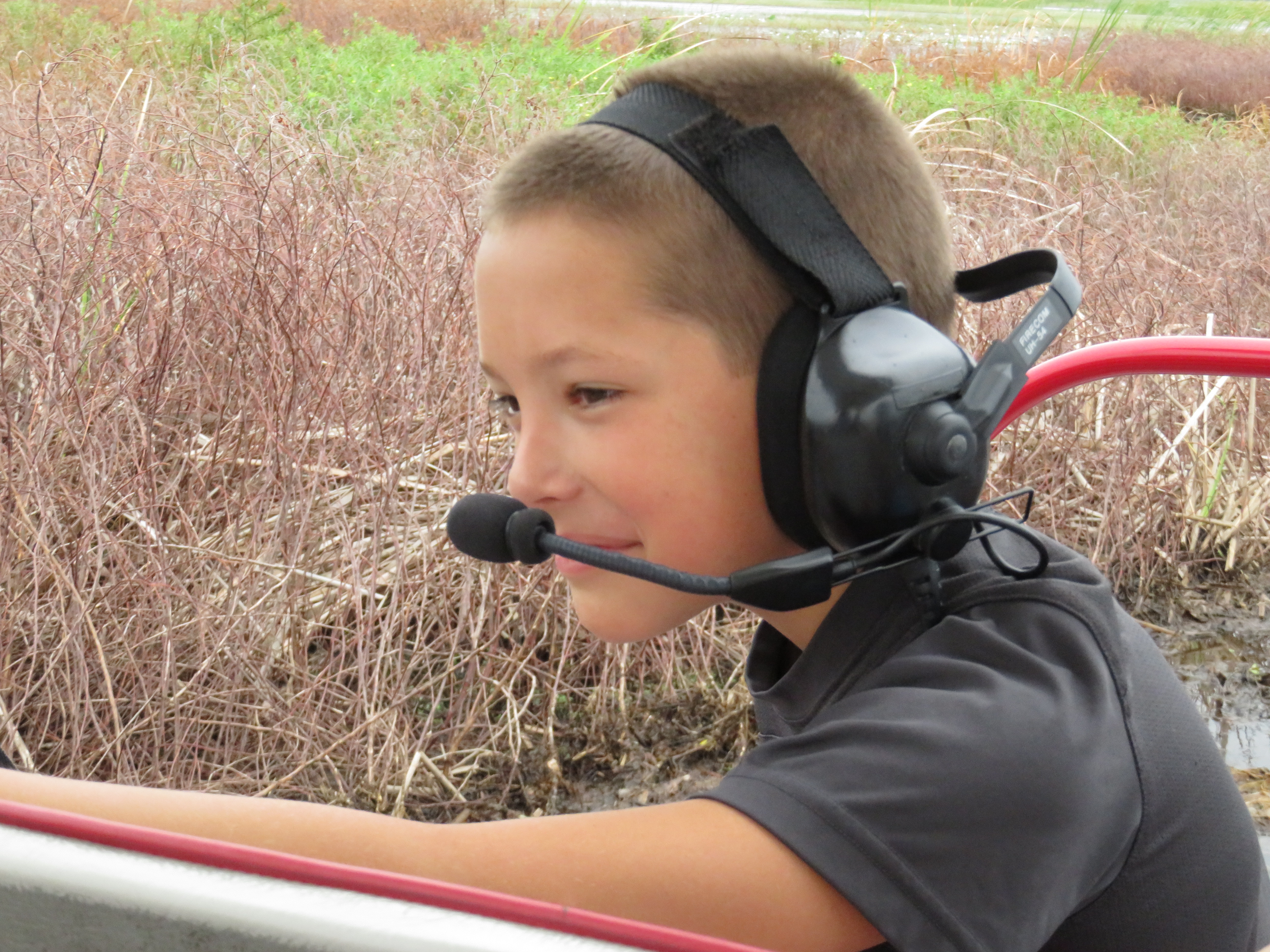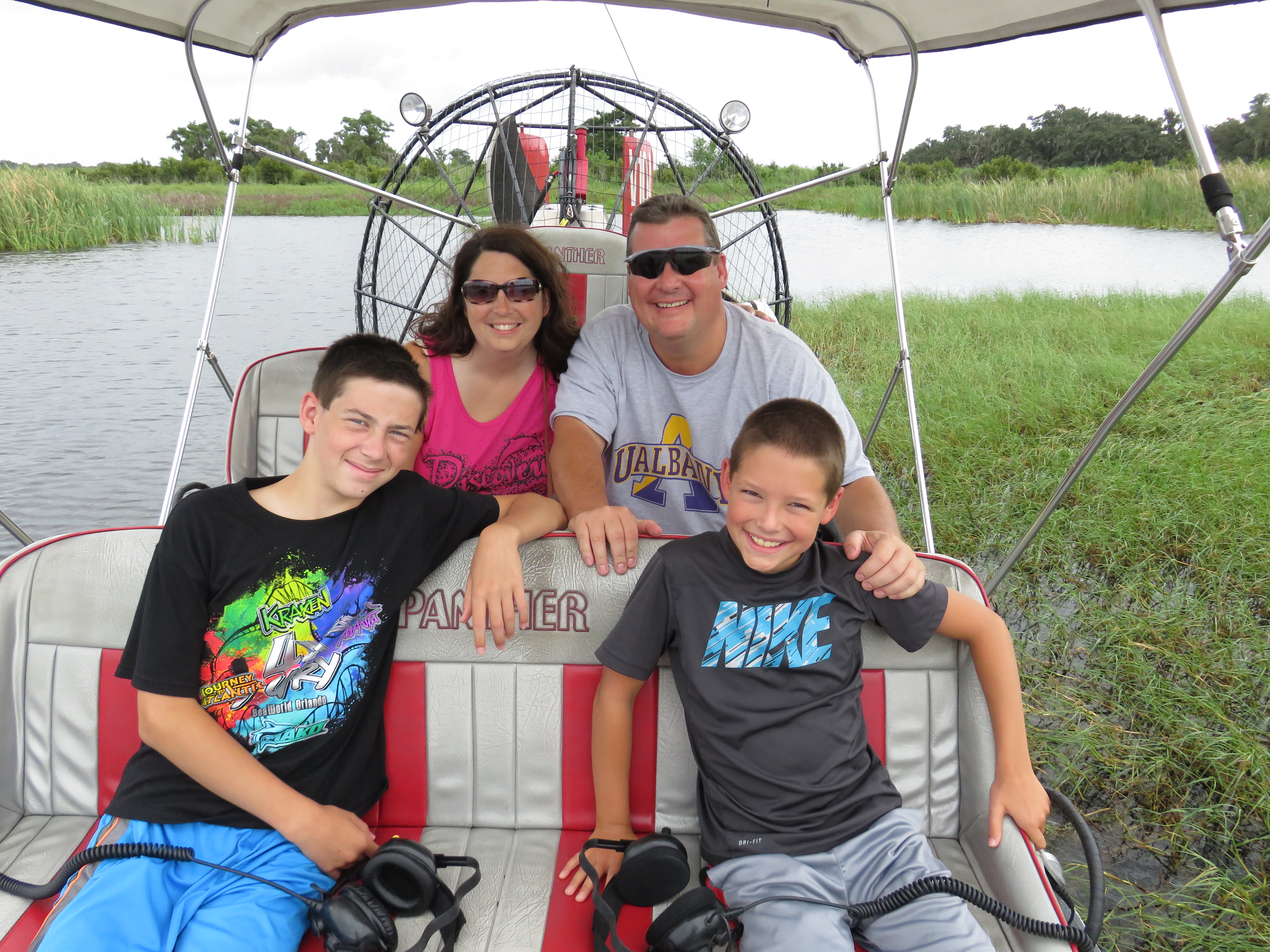 We met Captain Lynne from Spirit of the Swamp and boarded our boat after she put the canopy up since it was sprinkling. It was a small boat and it was just our family, which was really nice. We booked a 1 hour ride. We got on and were told about the headsets, we could hear the Captain and we could all speak as well without pressing anything and we could all hear each other. The boat is quite loud especially when going fast so the headsets are a must. As we were making our way along the canal out to the lake, Captain Lynne told us safety features and how the boat works.